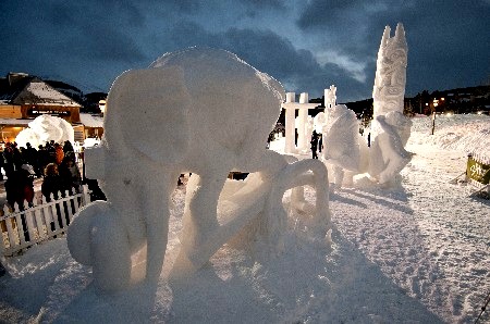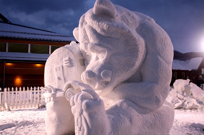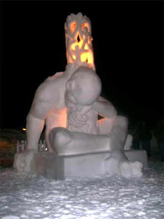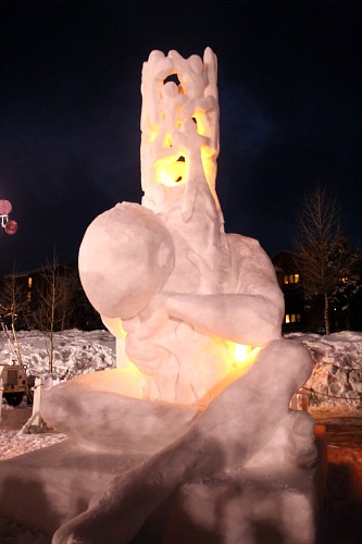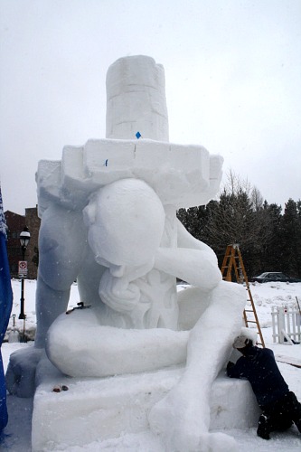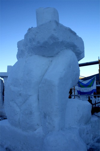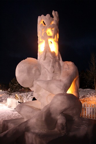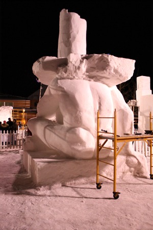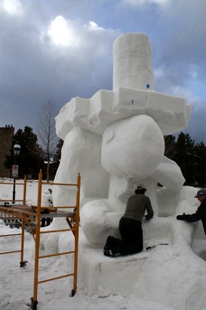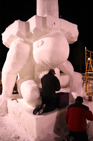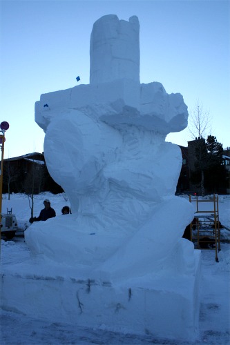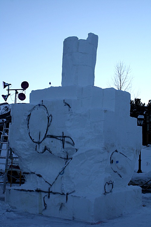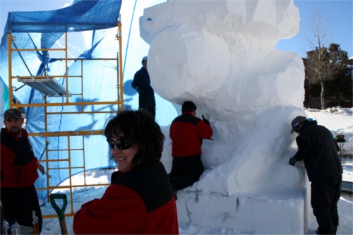 "The conditions were still challenging with temps hanging around 32 and heavy wet snow. We continued working to perfect the piece and it really started to come to life. We worked til 2am and plan on coming back by 5am to finish the piece. Everyone is very positive about Creation's Dream becoming a reality.