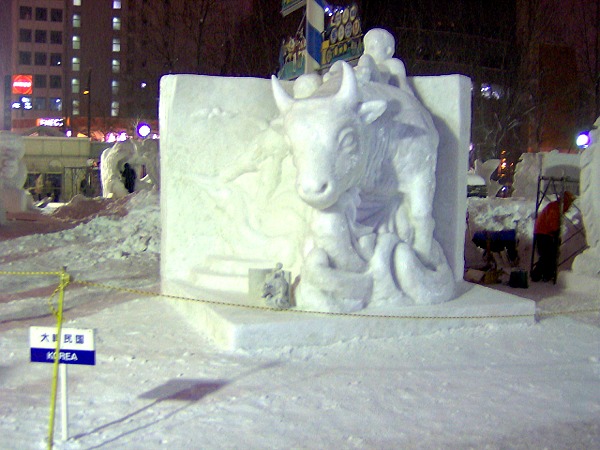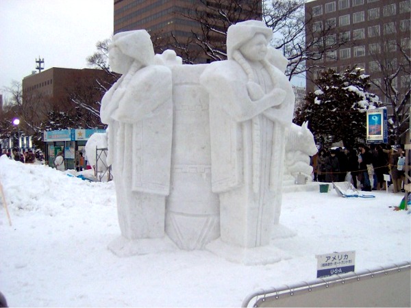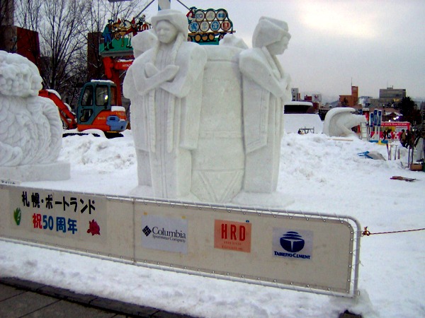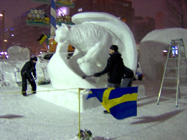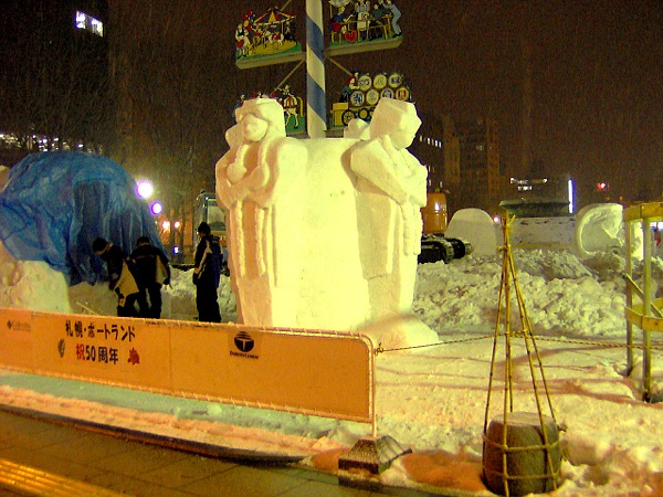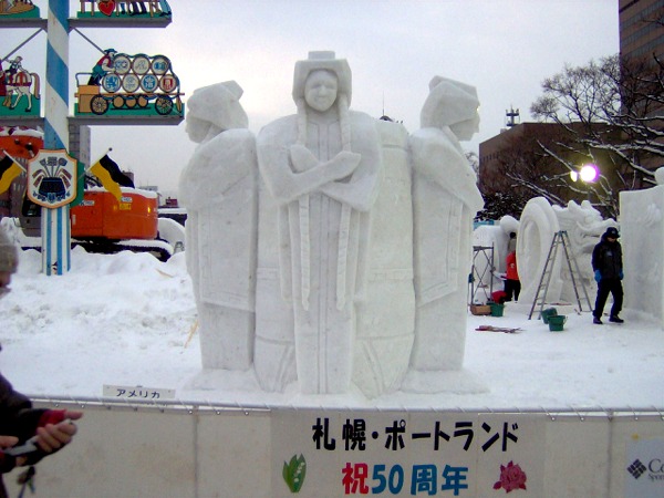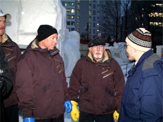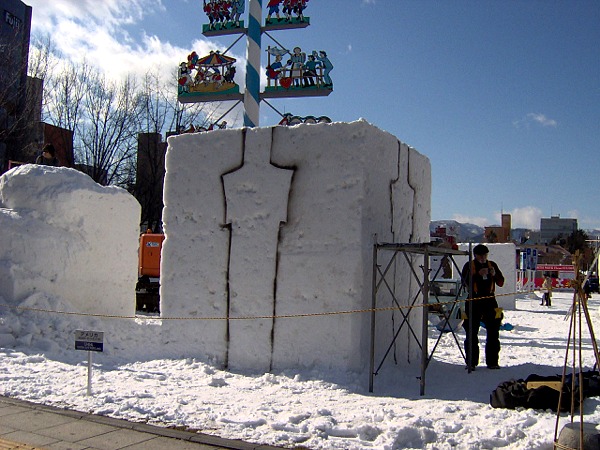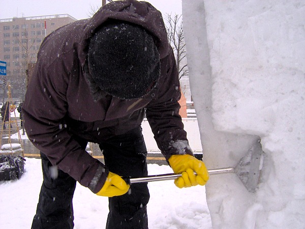 "Our second day went really well. We were able to get the 4 figures defined. Large crowds passed by as the snowy rain fell. No need to mix slush, the whole piece was s slushy snow cone. It’s wonderful to see all the Americans who are stationed here taking the opportunity to experience the culture of the Sapporo Snow Festival.