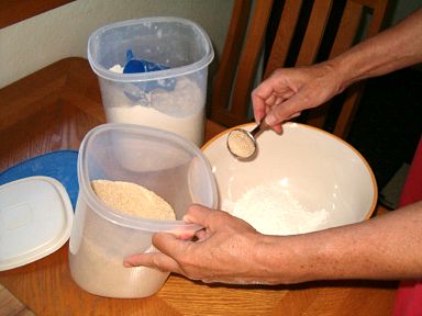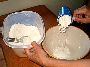 | 3 | Meanwhile, using the one-cup measuring cup measure 4 cups of flour into the mixing bowl. | ![]() |