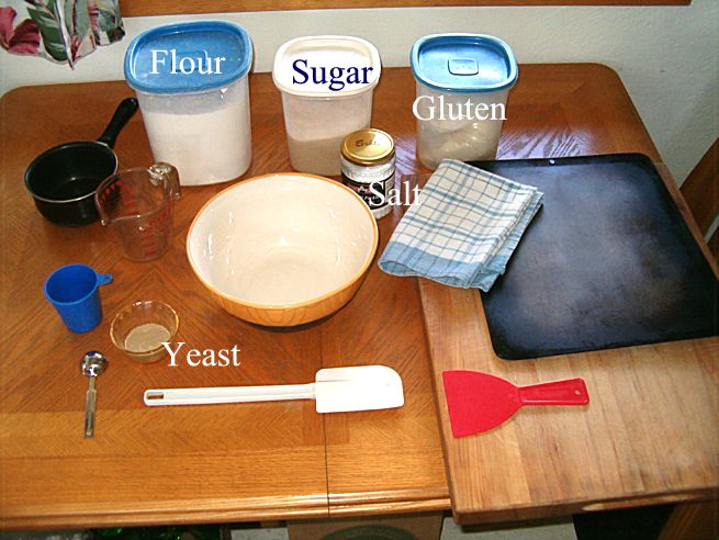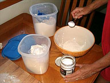 | 5 | Add 2 tablespoons of sugar, 1 tablespoon of salt and two tablespoons of gluten to the flour. | ![]() |