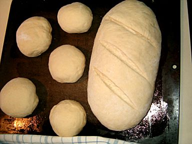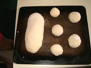 | 19 | Knead into one loaf the length of the cookie sheet. Place seam-side down on the cookie sheet and cover with the cloth. | ![]() |