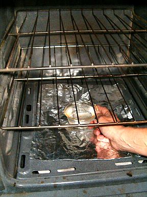 Add the yeast and stir with the tablespoon for a few seconds until it is well mixed. Fill the pyrex dish with water and place in the oven. |
