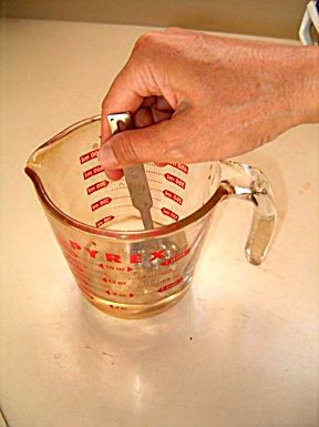 Using the pyrex measuring cup, put 2 cups of water into the small saucepan and heat to about 85 degrees (very warm but not unbearably hot to the touch | |