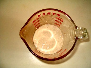 Put a little sugar (1/4 to 1/2 teaspoon) into the pyrex measuring cup and measure another two tablespoons of sugar into the mixing bowl with the flour. | |