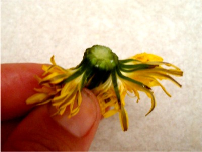 | Rinse and pull the bitter greens away from the blossom. | Slice off the bottom part with the stem and greens. |