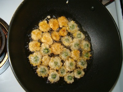 | Fry in hot oil, flip once and drain on paper towels. | Eat them with your favorite dip. They taste like mushrooms! |