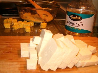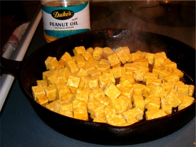 Heat a large cast iron skillet, wok or electric skillet. Slice Tofu into thin slices (1/8 inch) and press into Nutritional Yeast and Flour mixture. [Note: the photos show cubes, but we've found the slices to work best for ease of frying and laying into sandwiches.] Flip and press breading into the other side. Remove to a side plate or cutting board. Add Peanut Oil to hot skillet on Medium to medium-high heat. When oil is hot, add the Tofu. Let fry well on one side before turning over. When the tofu is nicely browned on both sides, Drizzle Soy Sauce over it and turn off the heat. If there is more Tofu to be fried, rinse out the pan before adding clean oil.