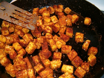 To Make Pan Gravy: After frying the last pan of tofu, sprinkle Flour into hot pan. Add Milk or Water, scraping up the crusty pan bits and stirring constantly until it thickens into gravy.