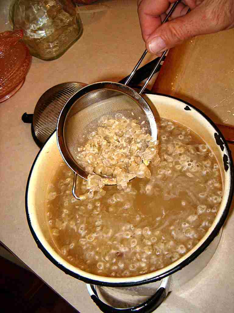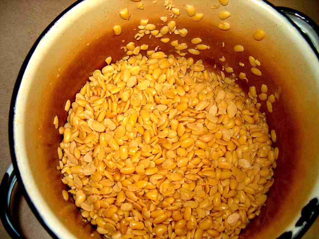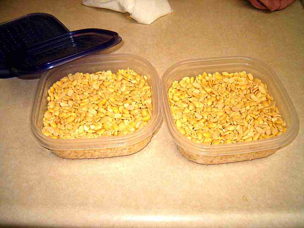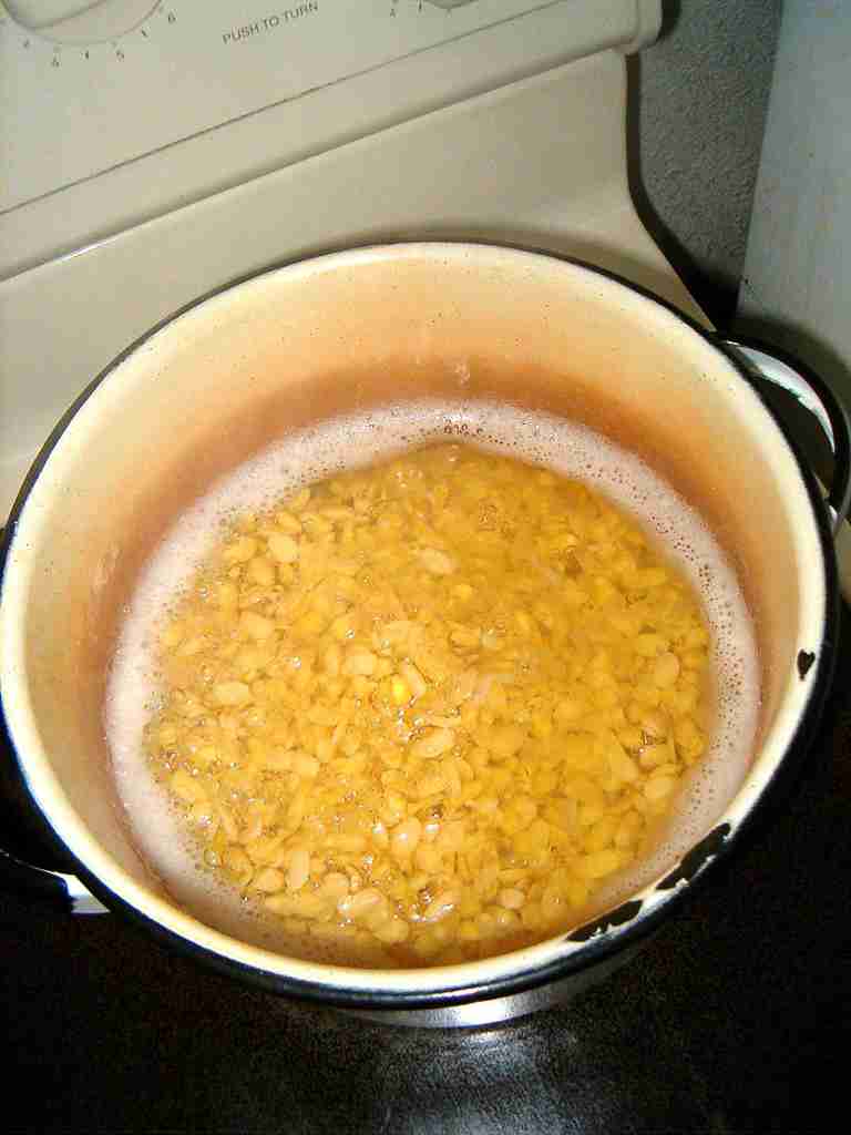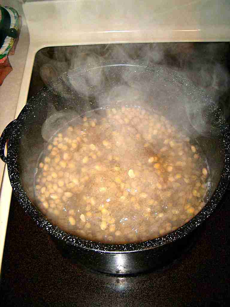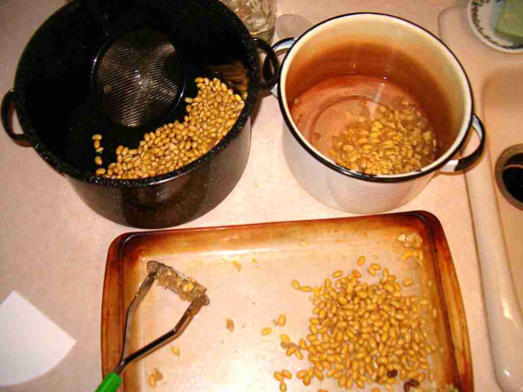 The first step is to de-hull the beans. Boil whole soy beans 15 minutes, then turn off and allow to sit 2 hours. | |