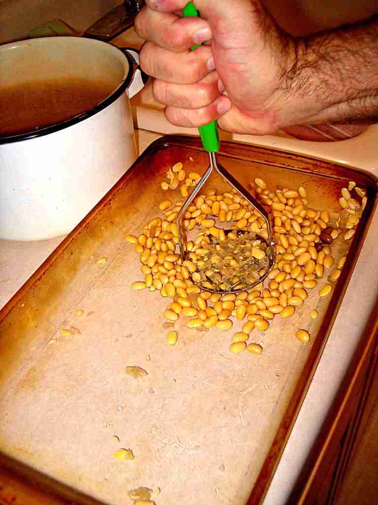 A firm "rocking" motion with the masher works well to split the beans and liberate the hulls. | |