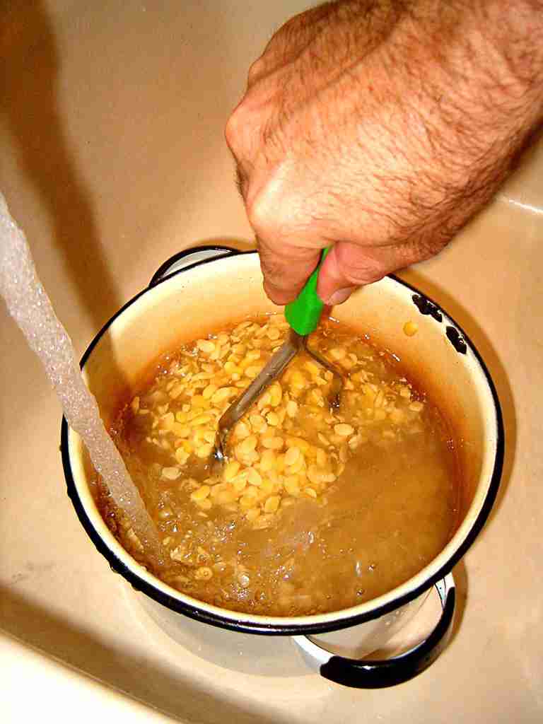 After skimming the hulls, mash the beans some more in the pot to liberate more hulls. The de-hulling step is the hardest part - it takes me about 10 minutes for 2 cups of beans. | |