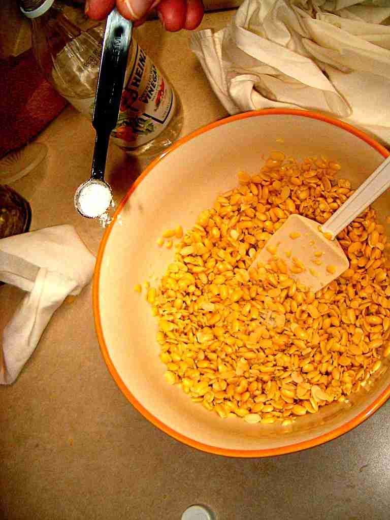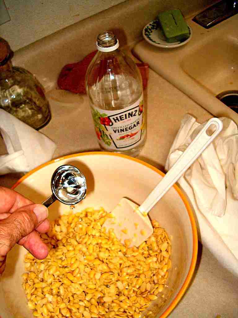 Add 2 tablespoons of vinegar to the beans and mix well. Then add 3/4 teaspoons of tempeh starter to the beans and mix well again. |