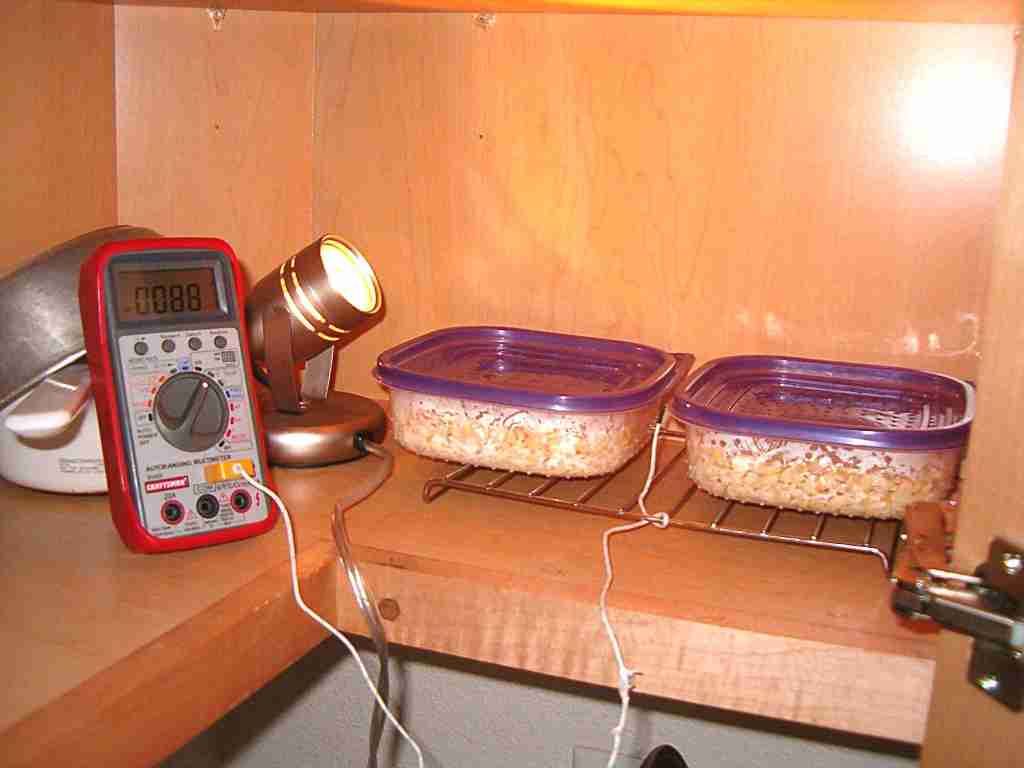 | 12 | Here's my setup for an incubator. I use one of my kitchen cabinets in which I placed a heat source (a lamp with a dimmer switch) and a thermometer. (My thermometer happens to be a function on my multimeter.) I have placed the Tempeh containers on a wire rack to facilitate air circulation. I adjust the light dimmer switch temperature as required to maintain the temperature in the cabinet to between 85 to 95 degrees F - trying to keep the temperature of the beans 88F for the first 12-15 hours until the Tempeh begins producing its own heat. At that point, I begin dimming the light and eventually turning the light off. I close the cabinet door and check the temp every hour or so, but not after I go to bed. | ![]() |