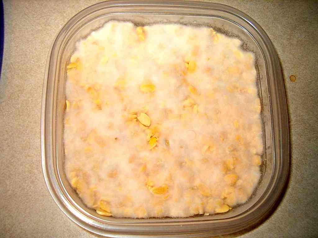 Here's the Tempeh at about 23 hours after inoculation with the starter. The white mycelium is starting to cover the entire surface of the beans, only a couple of more hours to go! | |