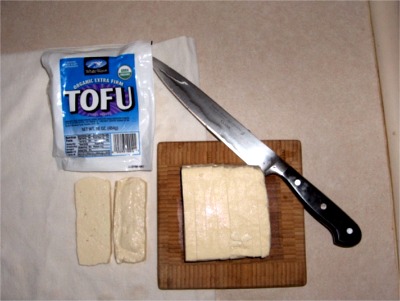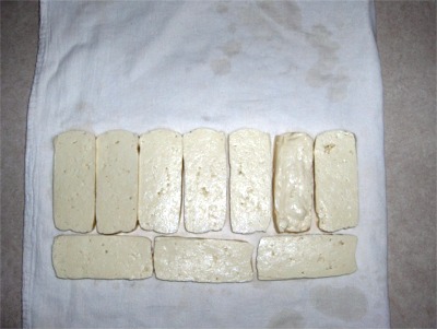 | Slice one pound into 10 pieces. Don't use boxed tofu. | Lay the pieces on a clean kitchen towel. |