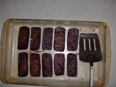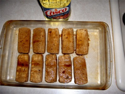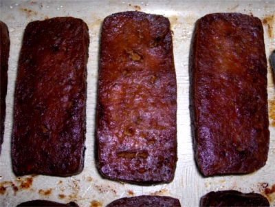 | Place the tofu in a leak proof container and marinate overnight using one cup of marinade. Flip the container over once halfway through to insure complete coverage. A square container would be even better than the one pictured here. | Bake at 300F for 45 minutes on a 9 x 13 pan greased with a tablespoon of soy oil. Turn them over after 30 minutes and again after removing pan from the oven. |