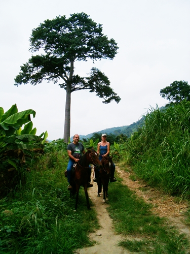 Elodie tirelessly campaigned against the destruction of this beautiful tree, meeting with public officials and suggesting that they move one set of power poles to avoid having to chop the tree. Her efforts were to no avail. The tree was cut down. Here is a picture of us astride two of Elodie’s horses with the tree in the background, taken in July.