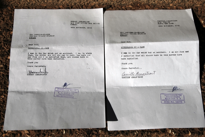 One minute Eric is driving us around Kumasi on our weekly shopping trip to fetch drinking water and food for the house. The next we are thrown forward by an impact from behind. Bob was in the passenger seat and Camille was sitting in the back behind Eric. We later heard that the truck did not have functioning brakes and that the driver had been advised by the owner of the truck not to drive it.