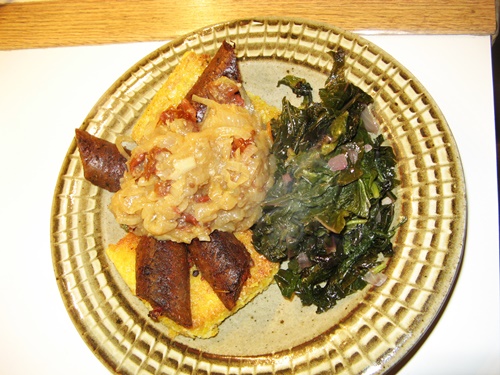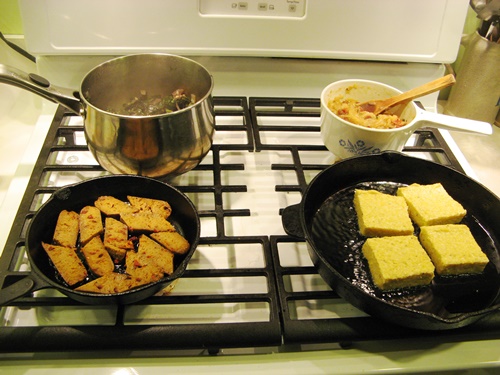 Often overlooked, but always appreciated on our menu, polenta is a pain to make, requiring 30 minutes of stirring the pot. But it freezes and fries like a dream. We served these fried corn cakes with caramelized onions and roasted garlic and served with Tofurky Sweet Italian Sausage and braised greens.