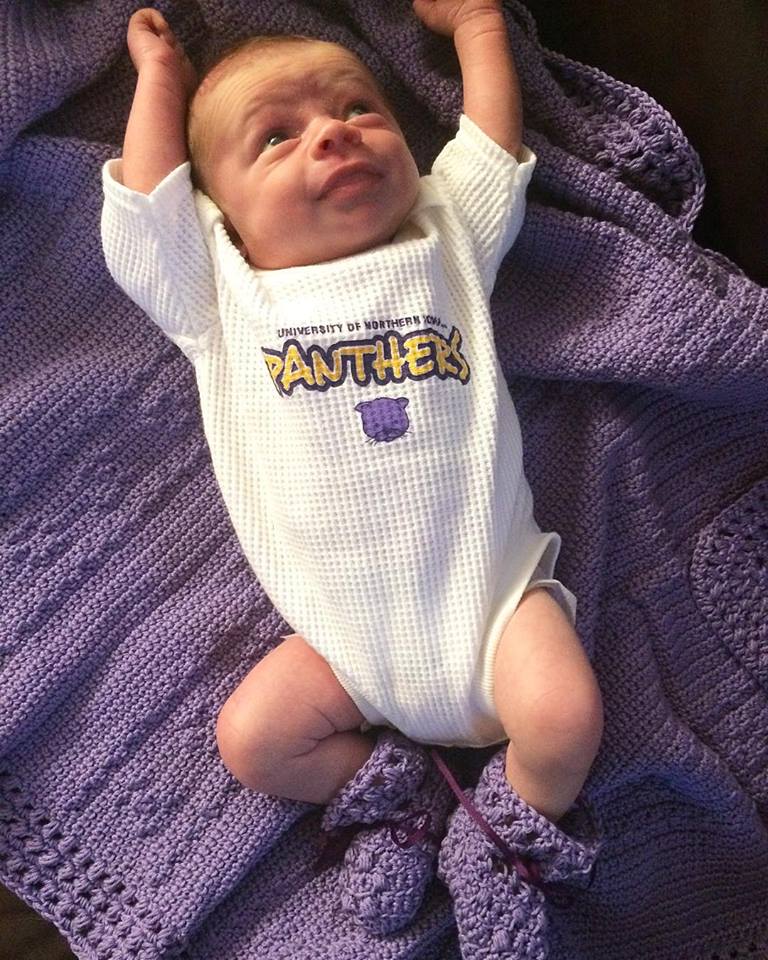 Amy explains the secrets of the universe to her new nephew and Nolan cheers the UNI Panther (The University of Northern Iowa) in his matching afghan and booties.