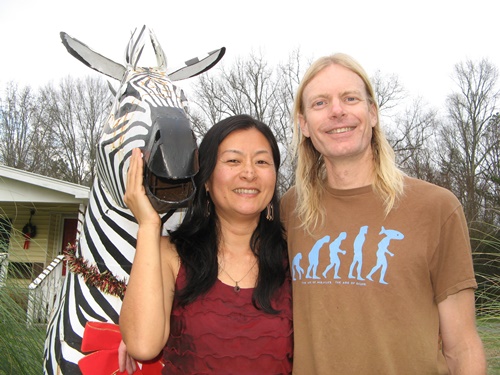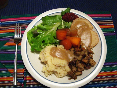 Ho hum, the usual… Quorn Turk\’y, chestnut/sausage stuffing, mashed potatoes and gravy, salad, home made cranberry sauce and roasted carrots. All but the sausage, turk\’y, chestnuts and wheat for the bread stuffing were grown in our garden or next door at Edible Earthscapes. Haruka topped off the meal with a killer pecan/sweet potato pie topped with divine vegan topping made from coconut cream, powdered sugar, vanilla and Grand Marnier.