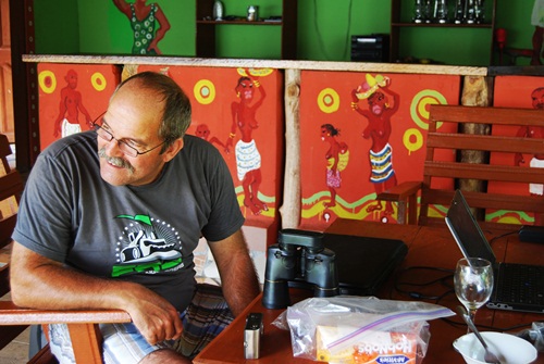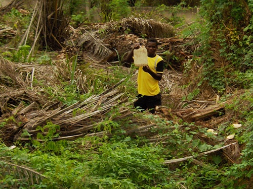 Bob noticed a man working close by the lodge and found out from Richard that he was making palm wine. Richard was kind enough to purchase some for us and we found it to be refreshingly good. Meanwhile, a flurry of gnats descended like a snowstorm. Justin, sipping the sweet wine in a cloud of gnats looked as if he were in a snowstorm. Meanwhile friends and family in the States were getting snowed on for real.