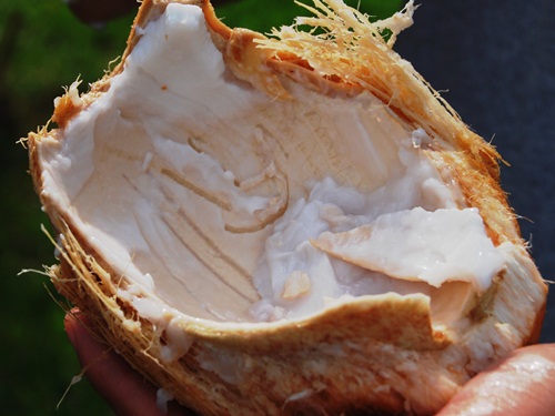 Justin and Cookie broke open their coconuts and ate the tasty, custard innards. Justin also rubbed the pulp on his hands to soften his skin.