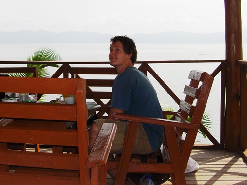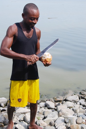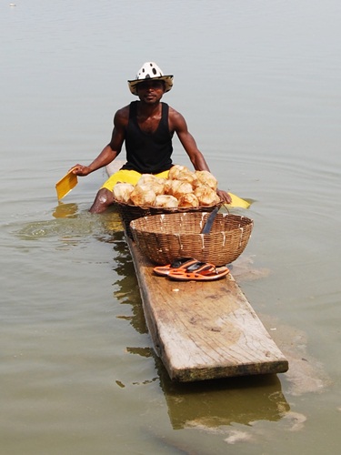 It was the thirsty part of the day, noon thirty or so, and we noticed the approach of a guy in a Holstein hat paddling a plank with a basket of green coconuts. Just the thing to quench our thirst! He deftly cut them open so we could drink the milk and after a laugh or two, paddled on to the next hot spot.