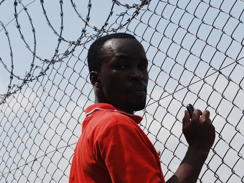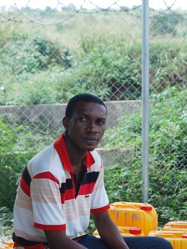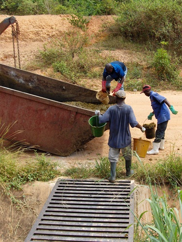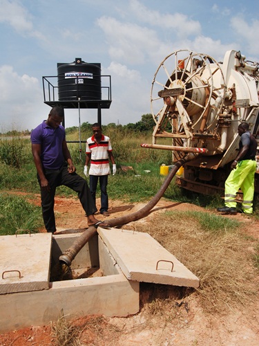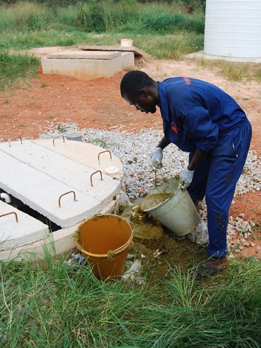 Johannes helps guide the sludge truck as it backs down the road towards the plant. The fecal “sludge” averages 97% water so it’s more like “dirty water.” The grate is there to keep any trash from entering the digesters.