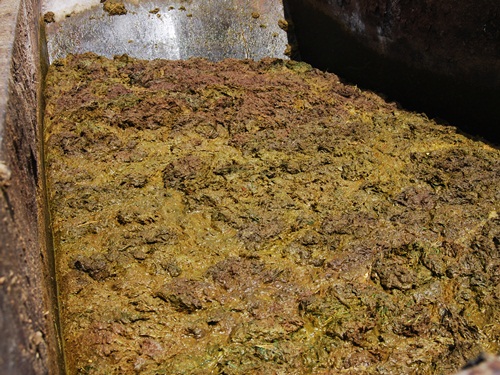 Rumen looks like a “grass-bile smoothie”. It was loaded through the two four-inch sample ports on the 10,000 liter digester.