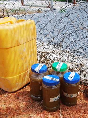 Wilson and Bob cut some pieces of plastic sheeting to serve as “bibs” around the sample ports to minimize the mess made by the rumen loading. On the right are four sample of the fecal sludge that were taken to characterize the incoming stream.