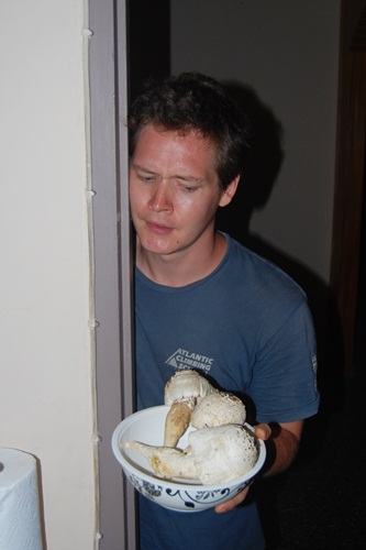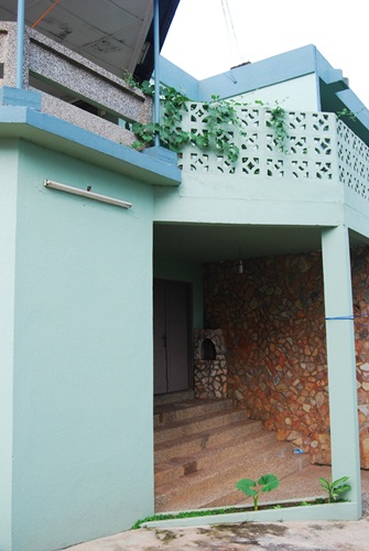 This is the main entrance into our downstairs living quarters. Our steps are sheltered from the rain (but not goat pee) by the deck where the upstairs garden grows. Jeremy inspects a trinket brought to our door by a trader who carefully laid out an enormous python skin for our consideration.