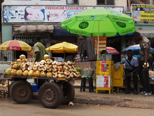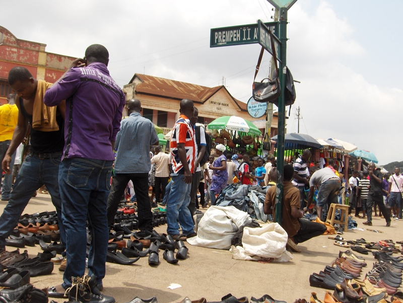 Fresh coconut on a handcart is a common sight. Buying shoes is easy here where this sort of roadside display is common. Second hand clothes get a second chance here on the sidewalks of Kumasi. Winklepickers, a fashion from the 50’s featuring a long, pointed toe are worn by all well-dressed Ghanaian men.