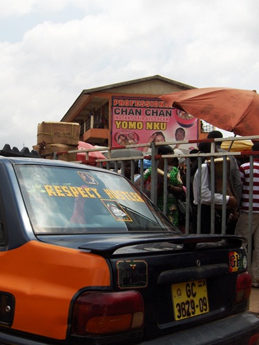 We are frequently baffled by the decals borne by taxis and tros in Ghana. This one, in the notorious Alaba district says “Respect Hustler.” Eric says this is his least favorite place to navigate due to the heavy foot traffic but decided to cut through to save time on this day. We also took note an older man in a hat commonly worn by migrants from the Northern regions.