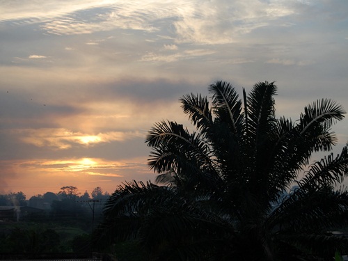 The sun rises over Kumasi for another day. We are greeted every day with bird song from the two trees next door and on those days when the sun has broken through the clouds, the sight of sunlight in the palm fronds.