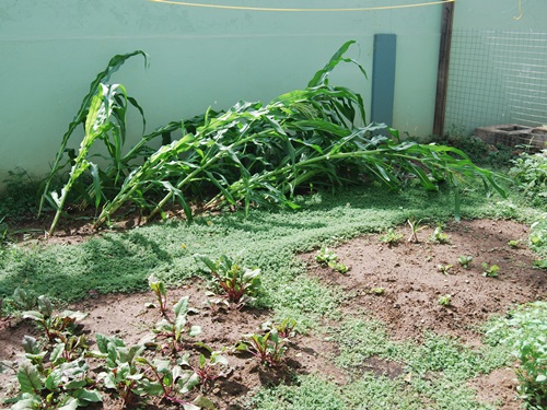 A bean stalk winds its way up one of the corn stalks. Another group of corn got swamped by a heavy rain and had to be propped back up.
