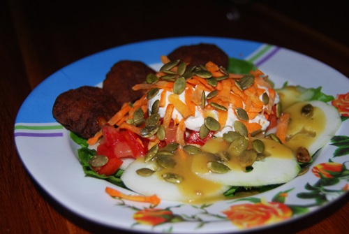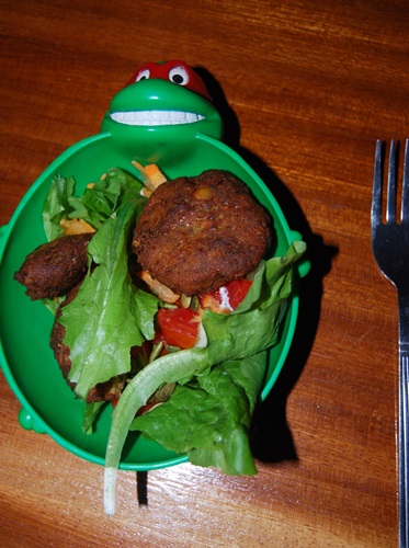 In case you didn’t already see enough pictures of this meal. First off, we are very proud to have a recipe and a process that yields good falafel (thank you, Angelina!) and second, we are fascinated by the signature presentations. On the left is Amy’s version of falafel night and on the right, Jeremy’s – Raphael is all smiles!