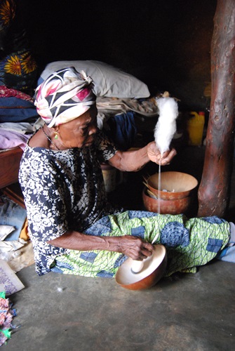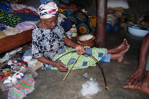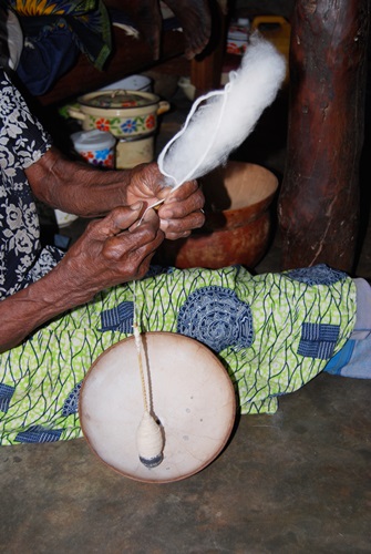 Her tools were simple, but her results were efficient and beautiful. She used a small stick with a round weight on the end like a top to spin the fibers while she continued to feed more cotton in. A calabash shell was used to keep the spinner top contained as well as to contain the residual fire roasted and pulverized cow bone powder that helps whiten the thread and resultant cloth. On the right you can see a cloth made from her thread. This will be her burial cloth. We were told that the custom in the village was for old folks to have their burial shroud ready.