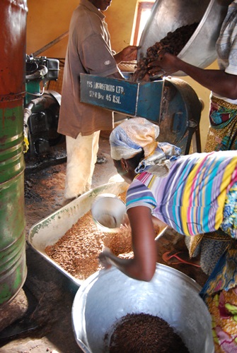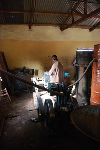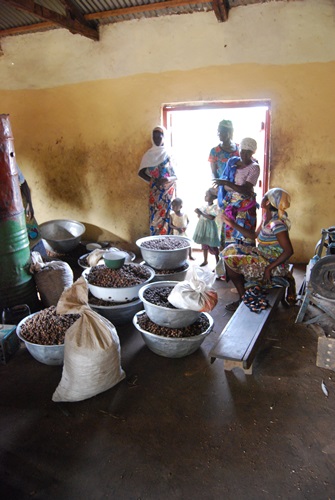 The ladies bring the hulled nuts in in headpans, and wait their turn to have their nuts crushed – they are not commingled with others lots. On the left you can see one lady feeding in her batch and another lady returning the crushed nuts to one of her headpans.