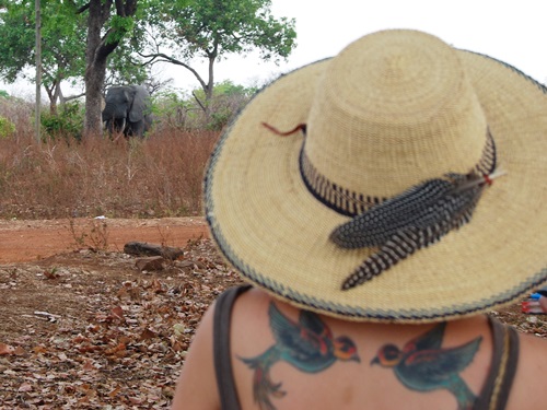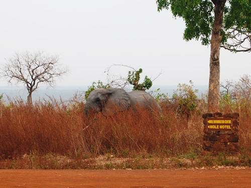One minute we were trying to focus on the tree Zach was describing, distracted by wart hogs. The next minute, Zach said, “Look” and there, across the road was a bull elephant quietly browsing, just minding his own business. One would think that elephants wouldn’t be able to sneak up on one. That they would come crashing through the undergrowth sounding like a herd of, er, elephants. But apparently, this isn’t the case in Mole National Park where you have to look sharp or completely miss a huge animal like this bull.