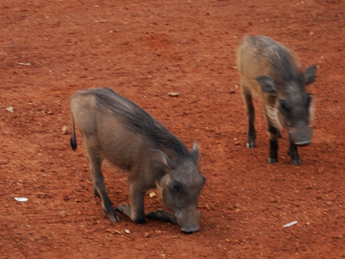 We passed the village where some of the kitchen staff lived and noticed that the inhabitants have adapted to the modern world by installing satellite dishes. We also noticed twenty or so wart hogs in various sizes nosing around the grounds. Their adaptation strategy involves using their knees to bring their vacuum-like noses closer to the ground.