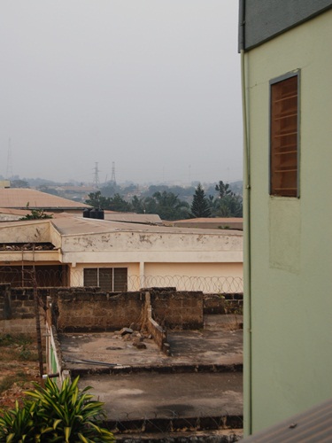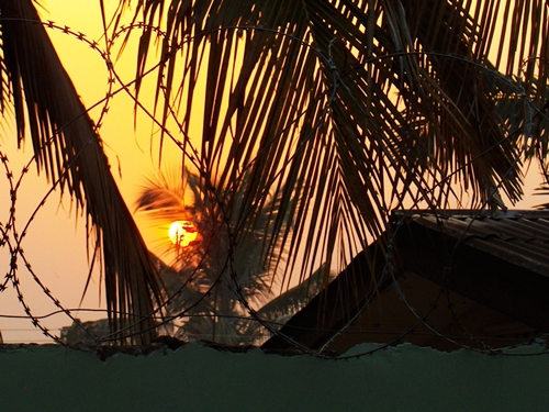 Happy News Year’s Day – a sun rise seen through razor wire and palm fronds! Winter in Ghana means dry season and Harmattan, the season in which the wind changes and blows dust down from the Sahara and making for an interesting sunrise on the first day of the year. The sky is hazy much of the time and will be until the wind shifts to blow from the south again.