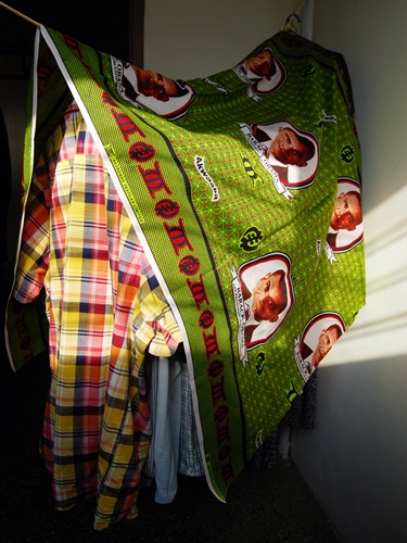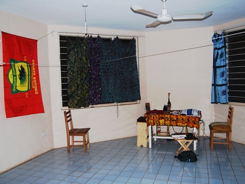 We spend a lot of our time in the octagonal room, doing yoga, occasionally hanging laundry and working at our desk with Camille’s pet giraffe, Jerome. This month Bob hung a Ghana flag and an Asante Kotoko flag. The Kotoko are Kumasi’s favorite football team and often play the Hearts of Oak, Accra’s favored team. Camille hung four panels of print cloth purchased at Central Market to serve as curtains behind Bob..