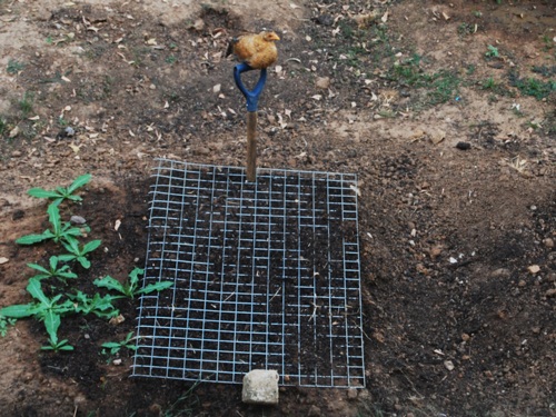 Chicken pressure called for some inventive beet planting on Bob’s part. He anchored a piece of fence with a broken shovel handle over the newly planted seeds to make it hard for the chickens to dig them up. Chickasaurus is using the handle for a perch.