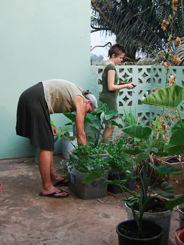 Bob shows off his beans. His garden includes Kontomire (known as Taro in Hawaii) parsley, the lemon grass, some bean starts, ginger and a bidet full of Caladium for fun.