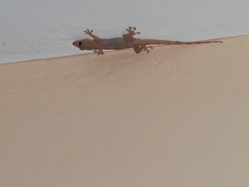 We are living temporarily in a massive rented house and always on the lookout for something to ease the monontony of white and beige concrete walls. Sometimes a gecko will pop out after dark and surely they leave some interesting decorations around the bases of our walls. We were very pleased when Amy brought a gift of a bright poster from friend Bobby. We thought it would look great and get seen multiple times per day if we taped it on the bathroom door.