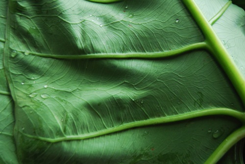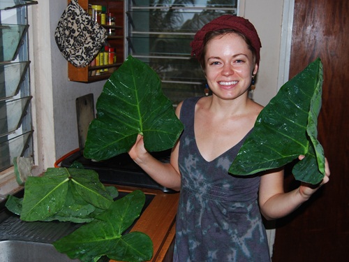 Amy prepared kontomire greens to go with one meal. She washed them, fried some garlic in butter and added the chopped greens. They were very tasty! The vein pattern on the under side of the leaves seems to flow backwards.