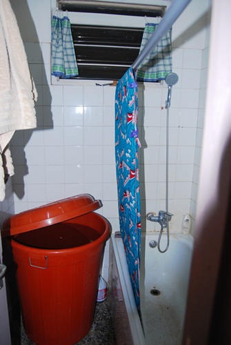 We’ve done a few things to make our bathroom work for us. Unpredictable water supply required installation of water reserves for bucket baths and toilet flushes. When neighbors moved in next door and were seen atop the roof at times, Camille added button holes to two kitchen towels for curtains. Bob added a piece of PVC pipe to act as a shower curtain rod. We secured a piece of fabric over the bar using clothes pins. We bought a mirror and keep a bucket under the sink for flushing when the water is out.