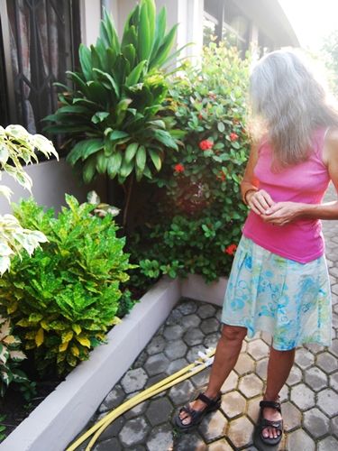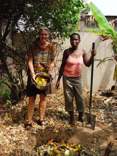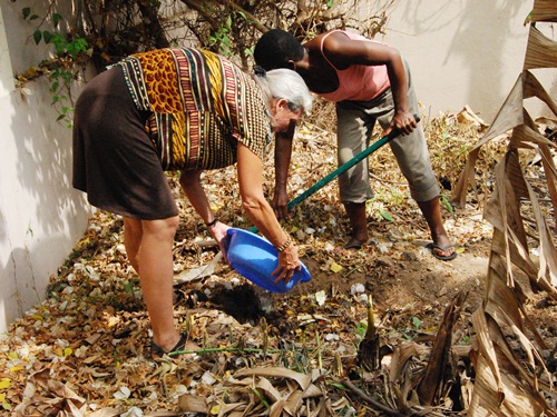 The three of us were touring the beautiful gardens when we noticed Dorothy heading behind the house with a pan of fruit peelings. Camille had a pan of banana, mango and pineapple peelings in the refrigerator and asked if we could add it in. “Of course!” Dorothy said. And this is what happened – we threw the compost into the hole, Dorothy covered it with leaves and Camille sprinkled a little water on it. Composting done correctly is just this easy!