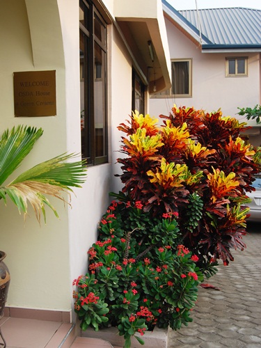 The owners of Osda House, Yaa Dorothy and Seth, have green thumbs. This is the main entrance where guests are greeted by a large, flowering “Crown of Thorns” and happy hedge of Croton.